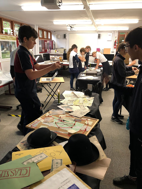 In the lesson, we placed a black tablecloth over a 4-row of tables, and strategically laid out props over it, so that it would seem like detectives were working a case, but had to quickly run out, and left in a mess, presumably to catch the criminal. We also blew out the fire, to give it an eerie vibe. This could make the movie seem like a thriller, police-procedural, possibly set in the mid 1900s, around 1960, as there were bolars, and lots of old money lying around.
